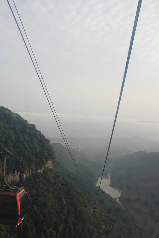 天门山索道全程7千多米,有的地方甚至38度倾斜,全程好像20分钟不到吧。远处的云烟特别漂亮,索道只在快接近上站的时候有些许摆动,其他时候还是很稳的。建议大家别像我似的总在索道厢体里拍照,其实山顶高处拍照更漂亮,厢体内拍照还有反光,所以还是全身心感受下全程的风景吧!