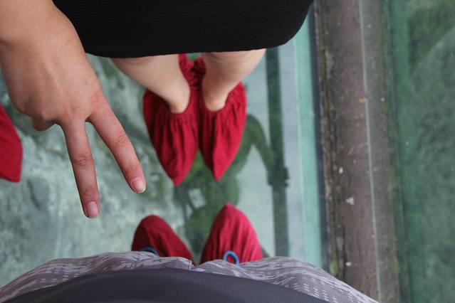 玻璃栈道上,必须穿戴景区提供的鞋套