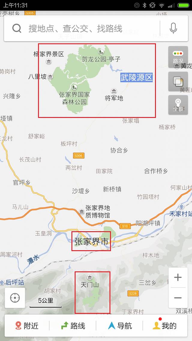 百度地图截图,可以清晰地看到市区、天门山、武陵源的相对位置