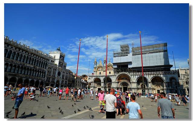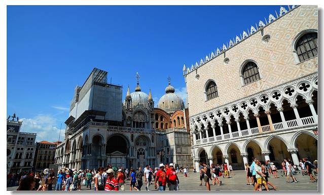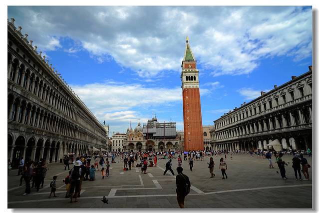 圣马可广场(Plazza San Marco) 又称威尼斯中心广场,一直是威尼斯的政治、宗教和传统节日的公共活动中心。圣马可广场是由公爵府、圣马可大教堂、圣马可钟楼、新、旧行政官邸大楼、连接两大楼的拿破仑翼楼、圣马可大教堂的四角形钟楼和圣马可图书馆等建筑和威尼斯大运河所围成的长方形广场,长约170米,东边宽约80米,西侧宽约55米。广场四周的建筑都是文艺复兴时期的精美建筑。