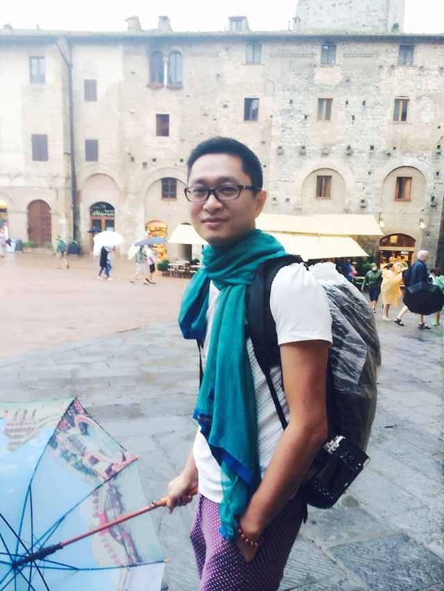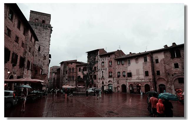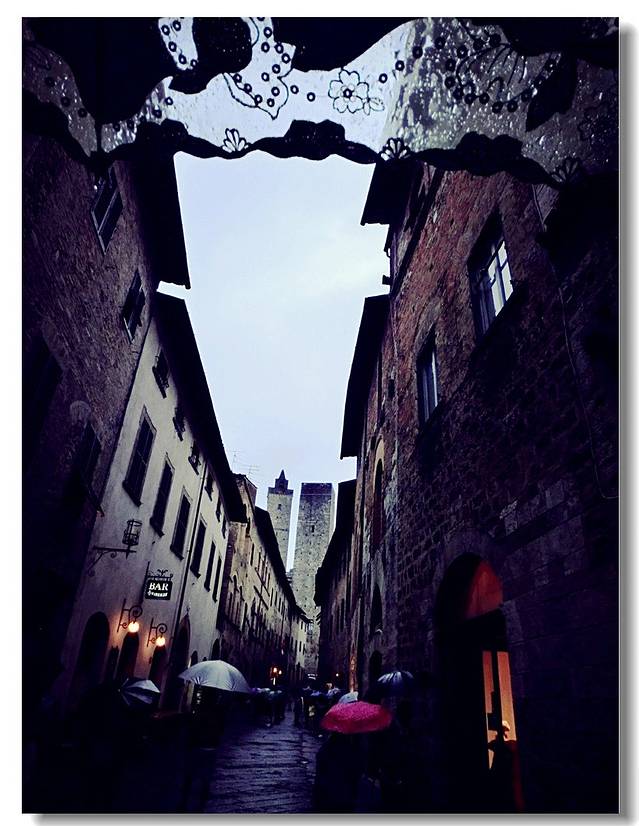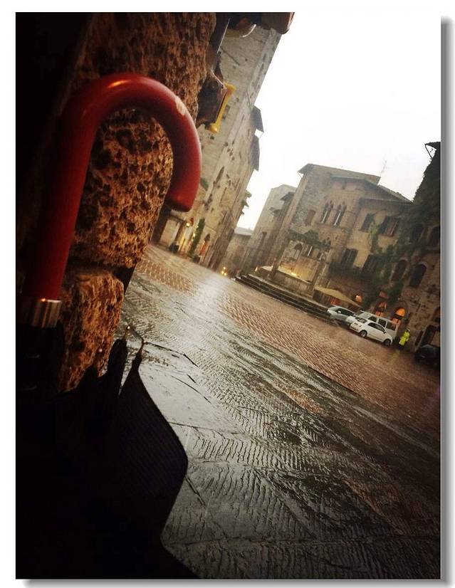 看我这造型:雨伞、相机包外挂、很文艺的围巾,大概就能想象出我们到达圣洁米亚诺时是什么光景。天公不作美,恰逢阵雨,意大利的夏天只要一下雨气温骤降,我们下车来发现车外温度低的出乎意料,风吹来人会簌簌发抖。好在自己开车,行李都在,于是各种披挂。。