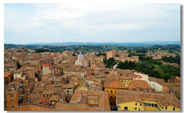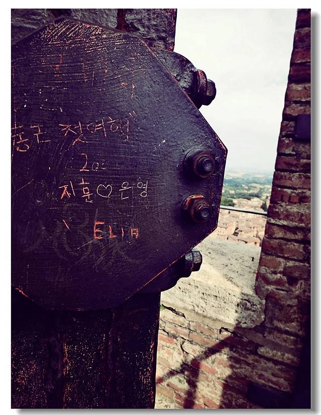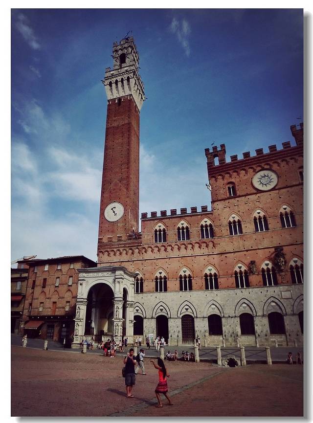 在锡耶纳我和二妹以及徐胖不辞辛劳,爬上了扇形广场上的百米高塔。这座塔楼已经有数百年的历史,楼梯很陡,全部石砌而成,仅能一个人通过,每过数层会有一个略大平台供两个人错身而过。没有电梯,全靠体力和脚力,我们一举登顶。登高望远的赏心悦目完全可以抹去登塔时的艰辛。。。。其实生活也是这样,无论过程多么艰辛,只要终得善果,事回头看我们走过的路,似乎也没有那么崎岖。只是在追去结果的过程中,你能否坚持格外重要。。。。