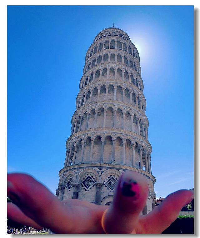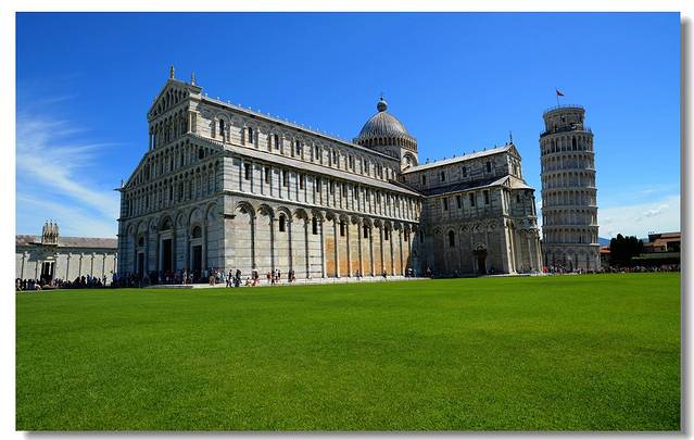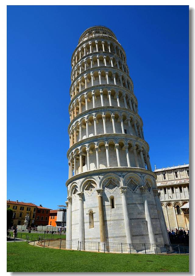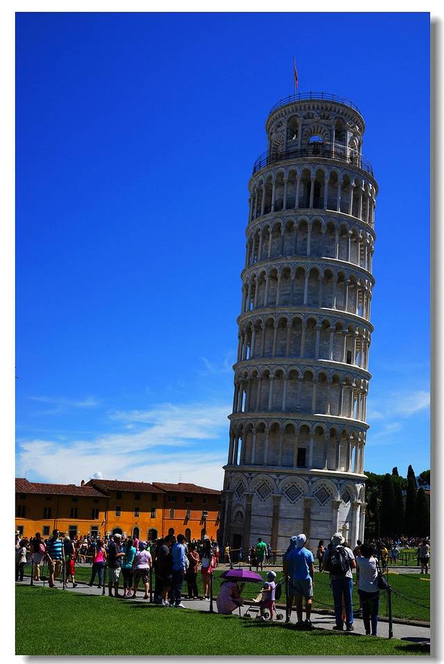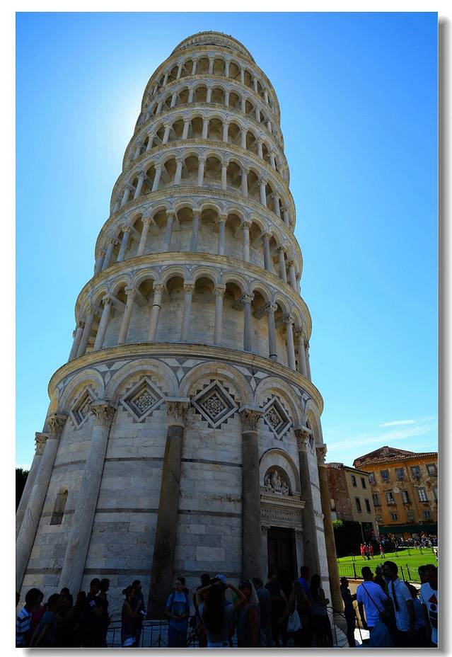 比萨斜塔修建于1173年,它由著名建筑师那诺·皮萨诺主持修建。它位于罗马式大教堂后面右侧,是比萨城的标志。开始时,塔高设计为100米左右,但动工五六年后,塔身从三层开始倾斜,直到完工还在持续倾斜,在其关闭之前,塔顶已南倾3.5米。1990年,意大利政府将其关闭,开始进行整修。但是我们去的时候似乎又开放了,反正看到很多人上塔去了。