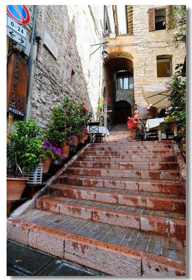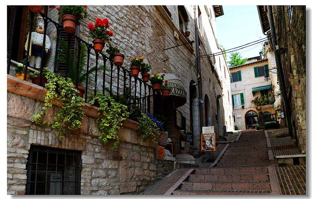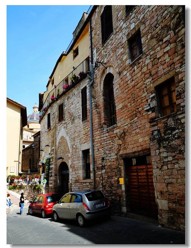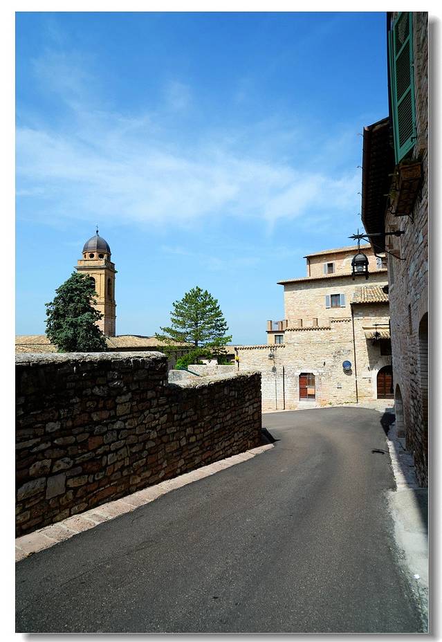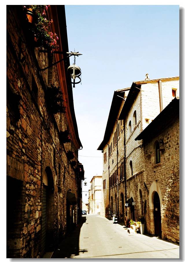 圣城阿西西(Assisi), 位于意大利翁布里亚大区佩鲁贾省,坐落于苏巴修山西侧山脊上,四周绿野环绕,古色古香。这座宗教气息非常浓厚小小山城,拥有十几间教堂,神父修士处处可见. 阿西西的古迹非常多, 5公里长的城墙包围之内,几乎完全保持着中世纪的模样。整个城市主要都用一种泛着淡淡的玫瑰色石头砌成,远远望去,这是一座玫瑰色的圣城。