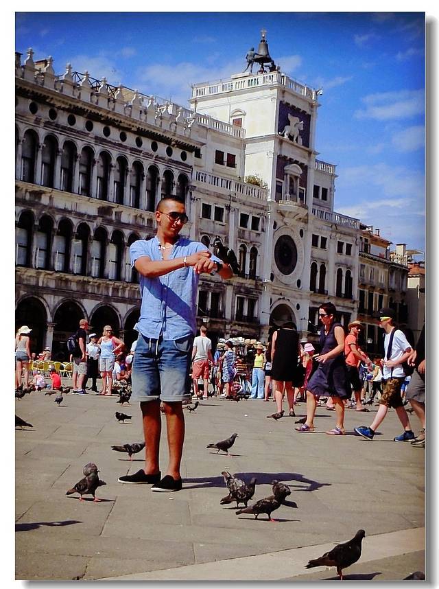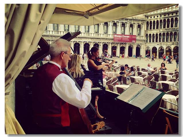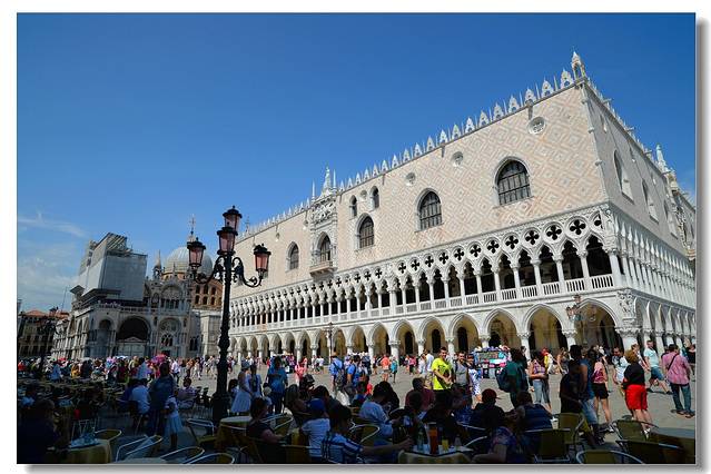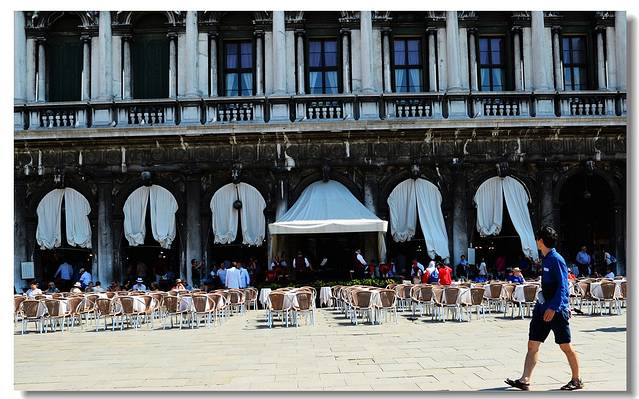 圣马可广场上很多B格很高的咖啡厅,有乐队演奏。上图据说是全世界最负盛名的咖啡厅,张导说那里不点咖啡,光坐坐就是5欧。本来想去装下的,后来赶着购物,没去成。