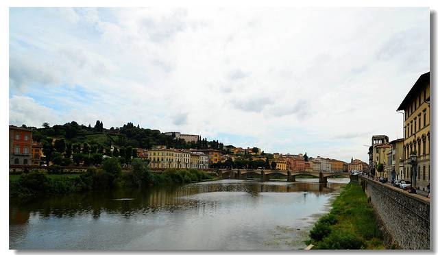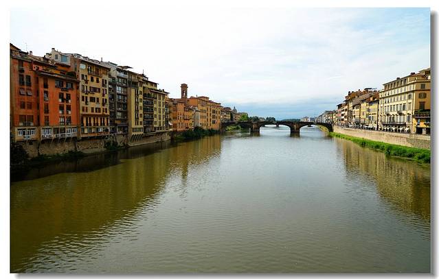 这是佛罗伦萨最古老的一座桥,所以称之为旧桥或是老桥。旧桥建于1345年,设计者则是乔托的弟子哥第负责的,桥上原本一间间的商店是铁匠、屠夫和皮革商,他们在1593年被费迪南度公爵赶走,改由珠宝店及金匠来承租,使这桥的气质整个改观。现在这桥上也是珠宝表行为主,看似破破烂烂,卖的却都是大牌。沿着这座桥的上方,有一条瓦萨利走廊,架空在商店的上方,连结河对岸的比堤宫和旧宫之间。