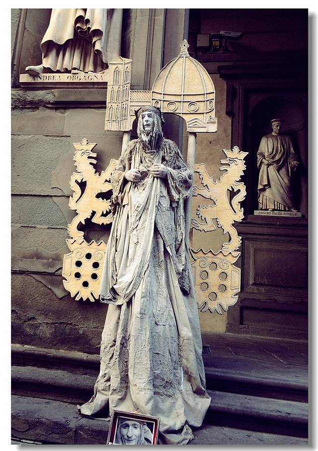 最后我们返回到圣十字广场的教堂旁吃晚饭,路过看到一行为艺术者,拍照留存。。。