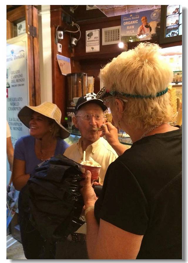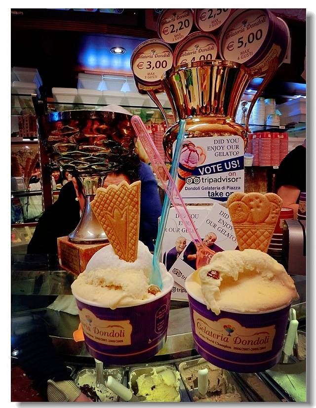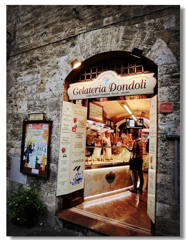 在圣洁米亚诺据说有世界上最好吃的冰激凌,这家冰激凌店也用各种语言打出了世界冠军的口号。但是后来在佛罗伦萨,导游说那里才是最好的冰激凌,因为是全手工的,确实也很多人排队买,不管怎么样,我们统统尝过了。。。