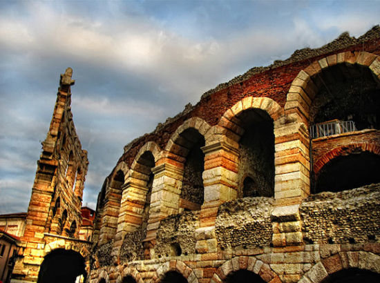 维罗纳露天剧场及维罗纳圆形竞技场。建立于公元1世纪奥古斯特王朝晚期,在古罗马剧场中,规模仅次于罗马斗兽场和坎帕诺圆形剧场,是全意大利保存得最完整的古罗马建筑之一,是世界保护遗产。