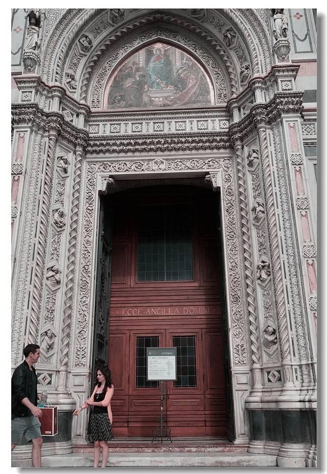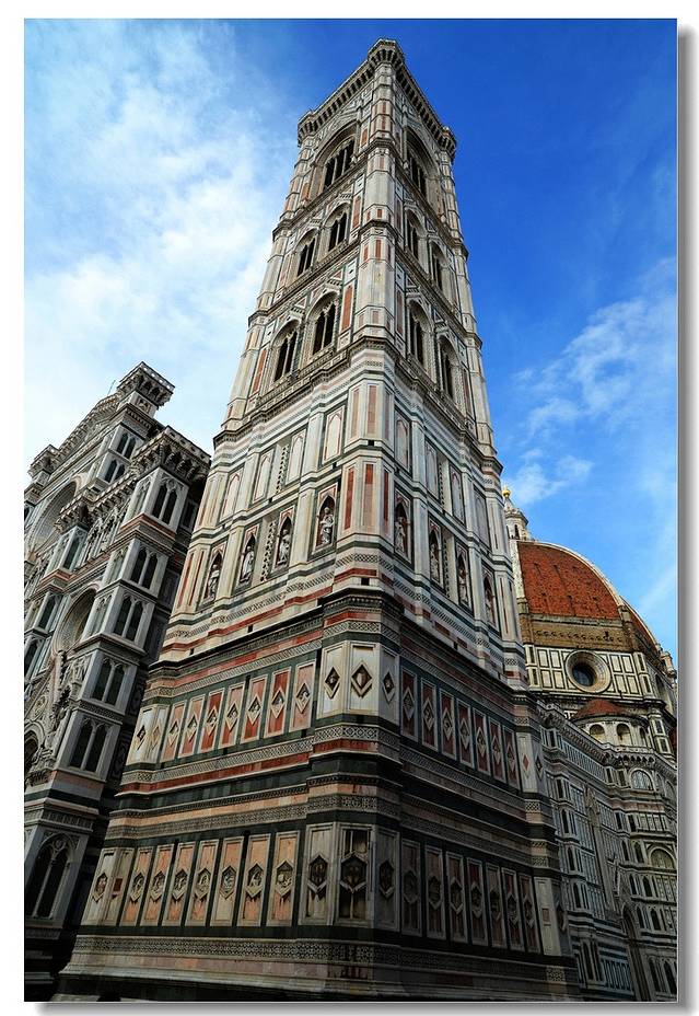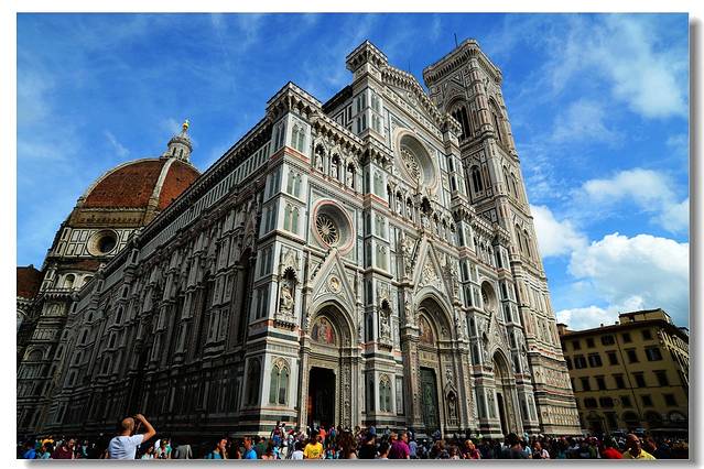 佛罗伦萨最著名的一组建筑—圣母百花大教堂(主教堂)、洗礼堂和钟塔被紧紧包围在duomo广场中心,人们要一直走进广场,抬起头来,才能看清主教堂的立面。广场和周围的街道,密密排着各色店铺,人来人往,非常繁华。这组建筑群不象比萨的那样仿佛是专门供人欣赏的陈列品,而是兴高采烈地挤在市民日常生活的漩涡之中。这是一座由白色、粉红、绿色大理石按几何图案装饰起来的美丽大教堂,除了白、粉、绿三主色外,还有红色、黄色、褚色……再加上一排雕像。佛罗伦萨大教堂(FlorenceCathedral)为意大利著名天主教堂。位于意大利佛罗伦萨,是意大利文艺复兴时期建筑的瑰宝。是世界五大教堂之一,世界第四大教堂。