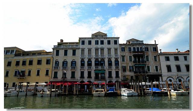 大运河可以和世界上最美的林荫大道媲美。它蜿蜒3.5公里穿过市区,深约6米,宽40-100米,两边立有别致的房屋。沿运河两岸矗立着近200栋的宫殿豪宅和7座教堂,这些矗立在水中,任凭潮汐侵蚀的建筑物,多半是兴建于14-16世纪,有拜占庭风格、哥特风格、文艺复兴式、巴洛克风格、威尼斯式等建筑风格,像条令人眼花缭乱的建筑艺术走廊。我们坐贡多拉的时候有一段航道经过大运河。。。