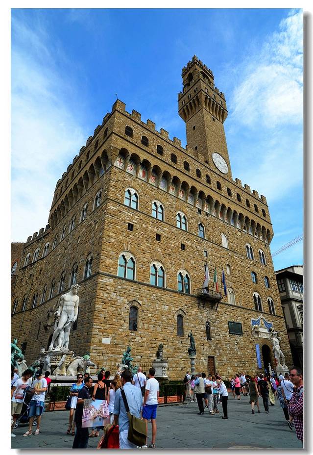 穿过狭长的街道,我们来到佛罗伦萨的又一个广场:市政广场,又叫领主广场,这个广场因为周围的精美建筑而被认为是意大利最美的广场之一。它始建于13、14世纪。最初是在被拆除的乌贝蒂、佛拉伯斯基及其他皇帝派家族的地基上建起来的。后经过扩建才形成了今天的规模。广场东南角的传统的行政中心——老宫(Palazzo Vecchio)雄视整个广场。老宫的左侧是美丽的晚期哥特式风格的琅琪敞廊。这个敞廊由本齐·迪乔内和西莫内·托冷蒂于1376—1382年建造,现在应该是美术馆。