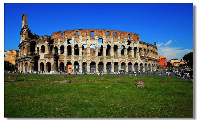 罗马斗兽场(意大利语:Colosseo),亦译作罗马大角斗场、罗马竞技场、罗马圆形竞技场、科洛西姆、哥罗塞姆,原名弗莱文圆形剧场(Amphitheatrum Flavium),建于公元72-82年间,是古罗马文明的象征。遗址位于意大利首都罗马市中心,它在威尼斯广场的南面,古罗马市场附近。从外观上看,它呈正圆形;俯瞰时,它是椭圆形的。它的占地面积约2万平方米,长轴长约为188米,短轴长约为156米,圆周长约527米,围墙高约57米,这座庞大的建筑可以容纳近九万人数的观众。