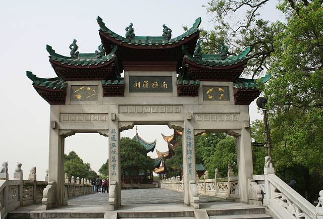 岳阳楼景区,有两座牌坊;靠南的一座,匾额是“南极潇湘”,背面匾额是“天边月白”;靠北的一座,匾额是“北通巫峡”,背面匾额是“江上风清”。