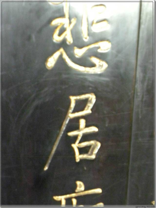 话说清道光四年(1824年),巴陵有个姓吴的知县,他想把《岳阳楼记》雕屏原件偷运到自己的家乡,占为己有,于是叫人按照原件笔迹,仿制一屏顶替。 摘下原件搬到船上,从水路出发。然而天理不容,半路风浪骤起,船翻人亡,雕屏失散。后为渔人打捞当做踏板。时过百余年,1933政府闻讯从民间赎回此屏,并油漆一新,归位故楼,装在二楼大厅正面。即眼下的二楼雕屏为张照原迹,一楼的为“赝品”。虽说是赝品,但做工精细,足以乱真,也历经百余年,堪称文物了。而且两者有一处微小的差别,说来还颇有意思----当年雕凿仿制屏风的工匠,对吴姓官员的偷梁换柱做法不满,就故意把“居”字的一撇刻的短了一些,暗讽其居心不良。请看下面两图: