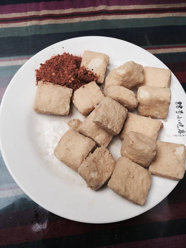 包浆豆腐,一口咬下去皮酥里嫩,再沾上干辣椒放入嘴中,味道好极了!切记,心急吃不了热豆腐啊~