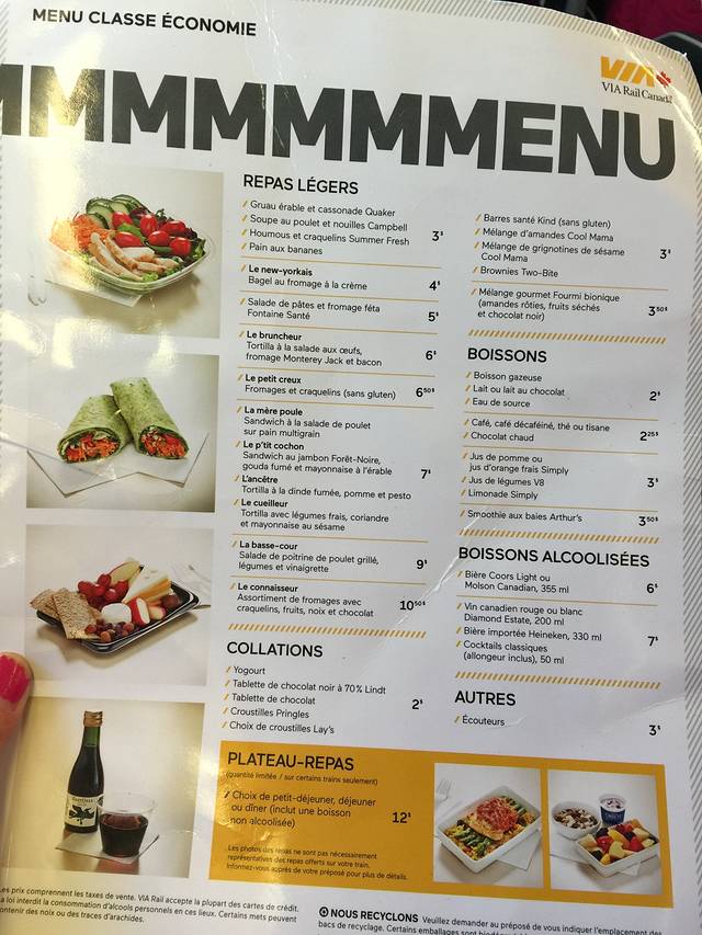 火车上的菜单,价格也比较亲民,一面英文,一面法文