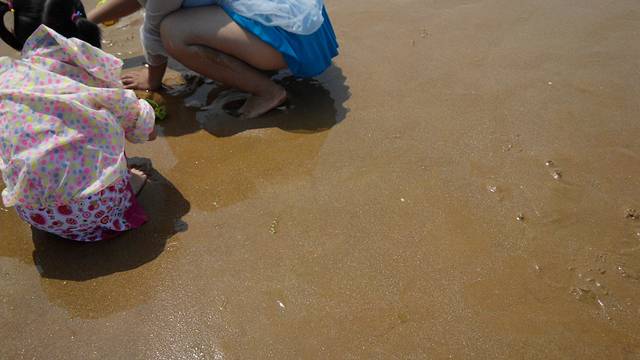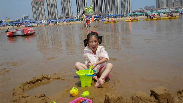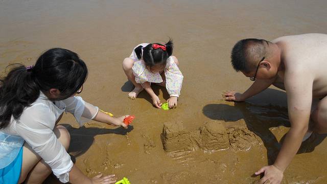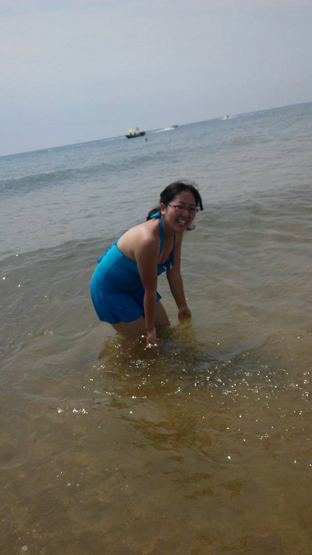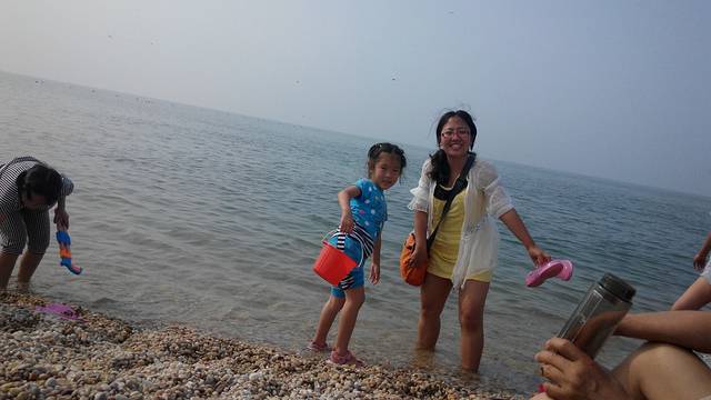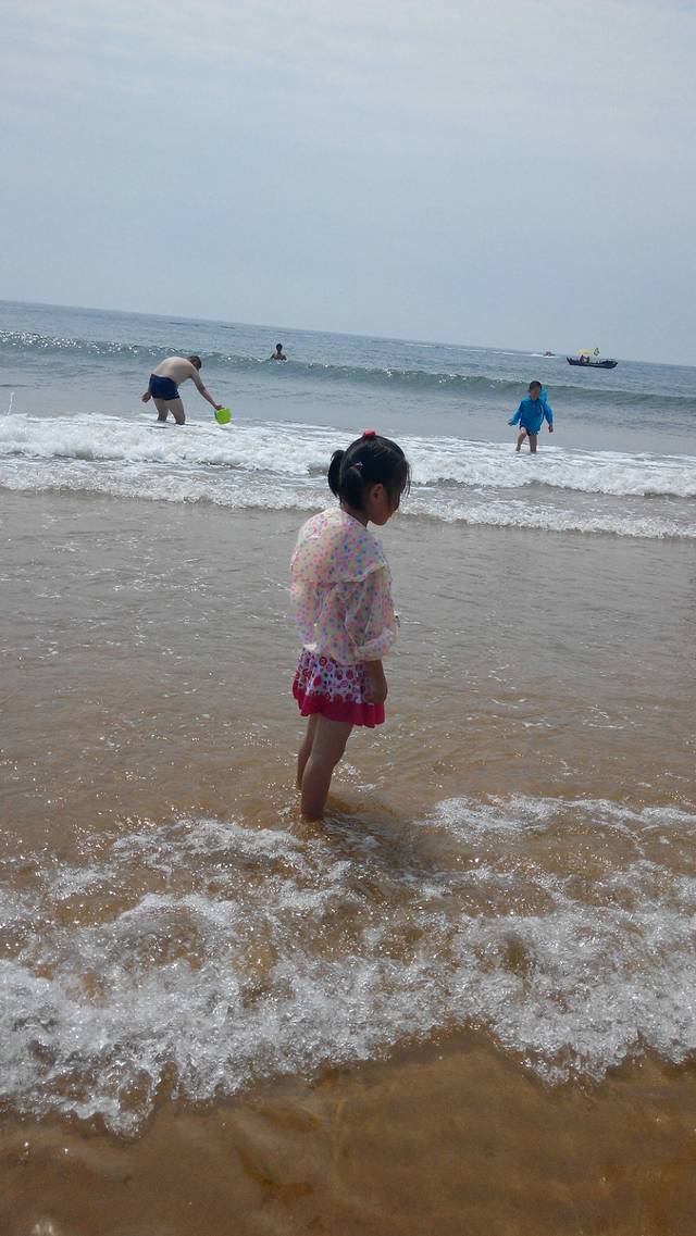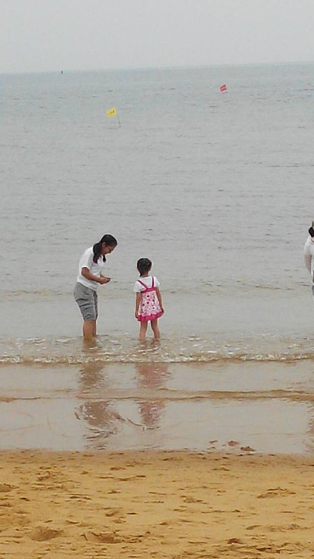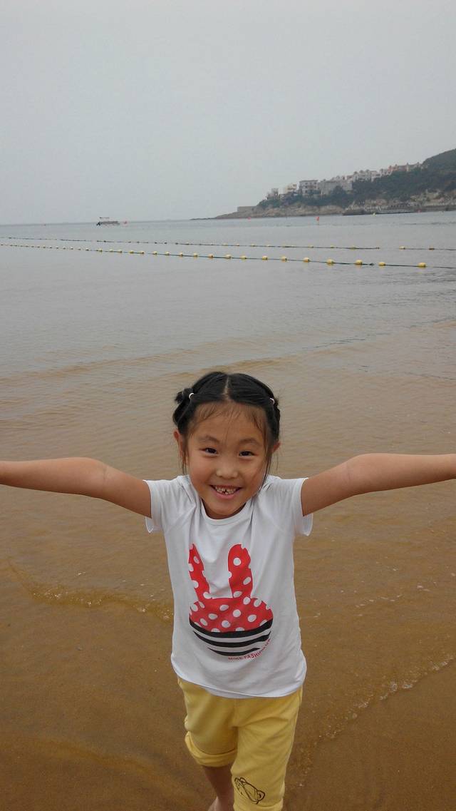 女儿的裤子湿了,只好换上了泳装,水还有点凉
