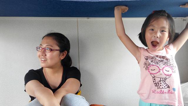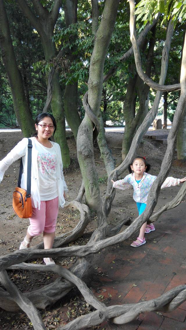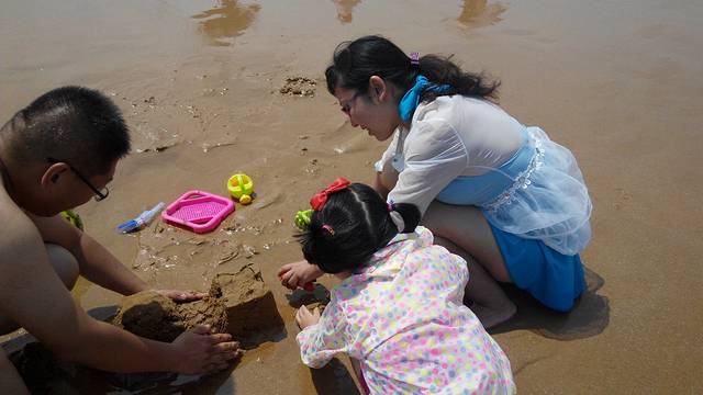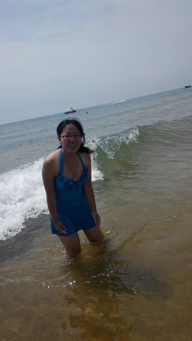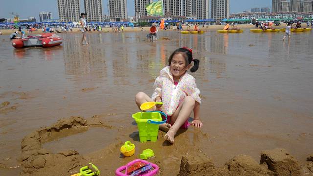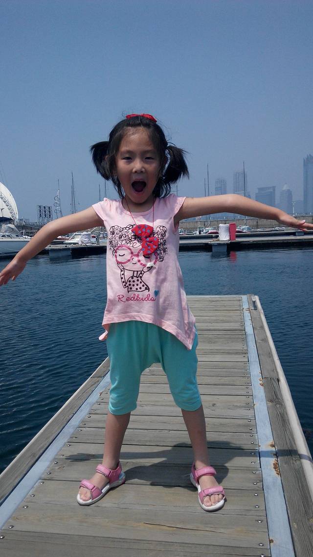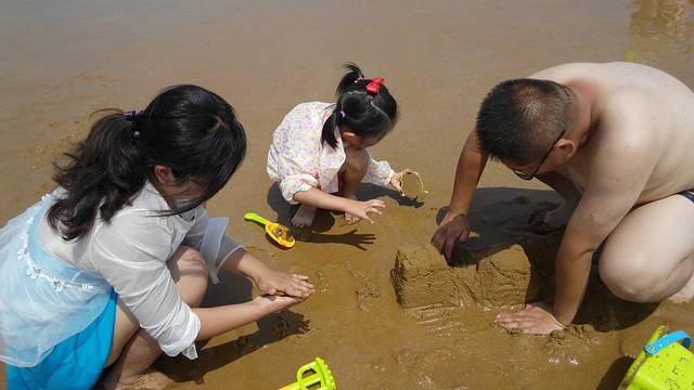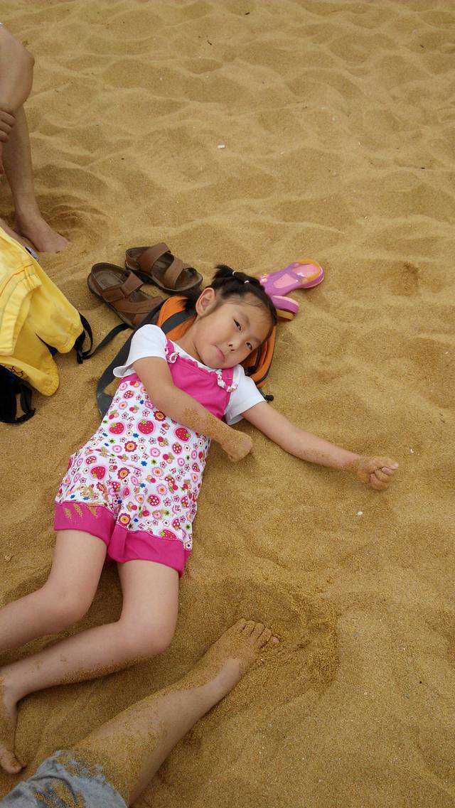 女儿的裤子湿了,只好换上了泳装,水还有点凉