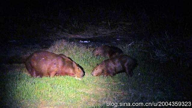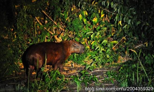 探照灯光停留在一群像猪一样的动物身上,在强烈的灯光下,它们我行我素,就像什么事情都没发生。当时,我们根本不知道叫什么名字,我们的才子cp给它一个雅号,"美洲豹的面包"。因为看着它傻乎乎的,没有任何反抗能力。