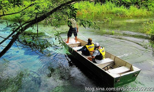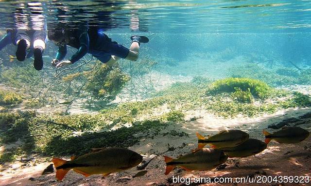 我们去博尼图清泉浮潜。到了清泉后,每人发一套潜水服和一套浮潜用具。这里的潜水服比一般浮潜服厚很多,主要是保暖和防止刮伤身体。换完衣服走了一段距离就到了清泉河边,一看那河水比想象中的要清澈许多。蓝天白云,岸边树影倒映于河面,远看它是那样的绿,绿得像一条翡翠色的绸带。近看,它是那样清,清得可以看见河底的一切,如果没有水中的鱼儿,你就像在树荫下,感觉不到水的存在。清清的水底,细细白沙和水下植物像是一幅自然的山水画。