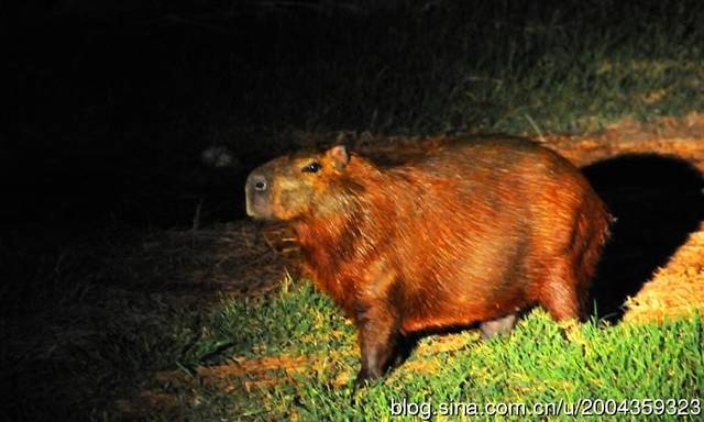 后来,在百度查到它叫做水豚,世界上最大的老鼠、最大的啮齿动物。它和老鼠的血统极为接近,可是比老鼠要大得多,有老鼠的100倍,身长超过一米,体重50公斤,就像家猪那么大。水豚出产在巴西、巴拉圭、委内瑞拉的河、湖泊、洼地、森林中植物丰盛的池塘、溪流边和沼泽地,栖息于植物繁茂的沼泽地中。它一生逗留在水边,也到水中去,潜水的“本领”很好,能潜几分钟入水底,在水底下面行走,有时把鼻孔、耳眼露出水面,呼吸空气,观察外界情况,美洲豹和猎豹是它主要的敌人。看来cp把它叫美洲豹的面包,还是有一定道理的。