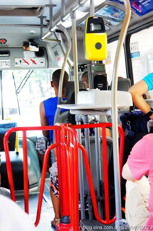 乘坐公交车去植物园,公交车前门上,后门下,当中有一个很窄旋转闸口,在黄色刷卡机上刷卡后才能通过,身体肥胖的人肯定过不去。