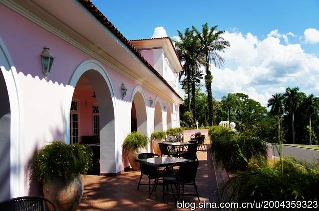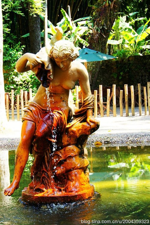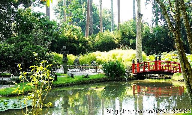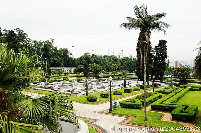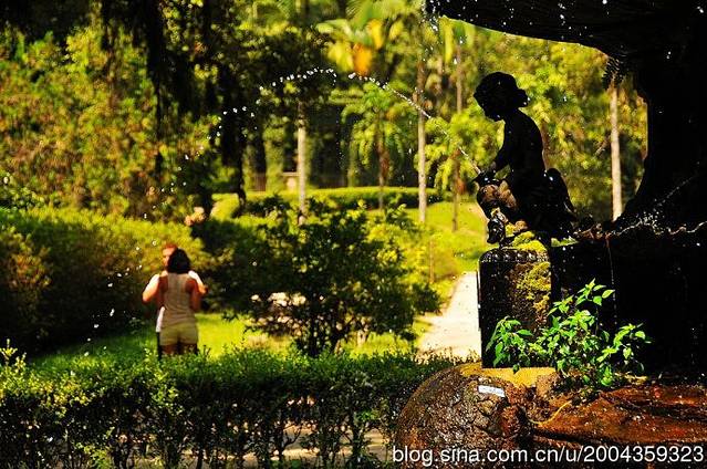 花园的中轴线是水池和喷泉,两旁是修剪整齐的灌木和草地,和高大的热带树木布局合理而对称。
