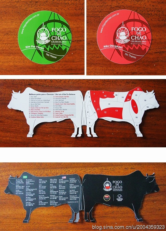 落座后,每人发一张卡片和一个塑料牌。卡片上标着牛肉部位的代号,塑料牌一面是绿色,表示需要肉的意思,一面是红色表示不需要,服务员根据颜色来判断你的需求。根据大家品尝一致认为22号和13号好吃,肥瘦适中、鲜嫩可口,但是烤羊肉更好吃。这家店虽然价格稍贵,但服务、烤肉都是一流的。你站起和落座,服务生给你摆椅子,觉得有点稍不习惯。