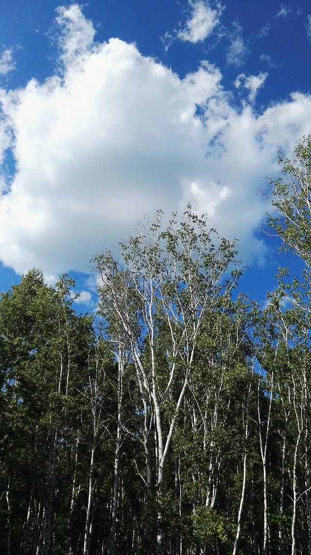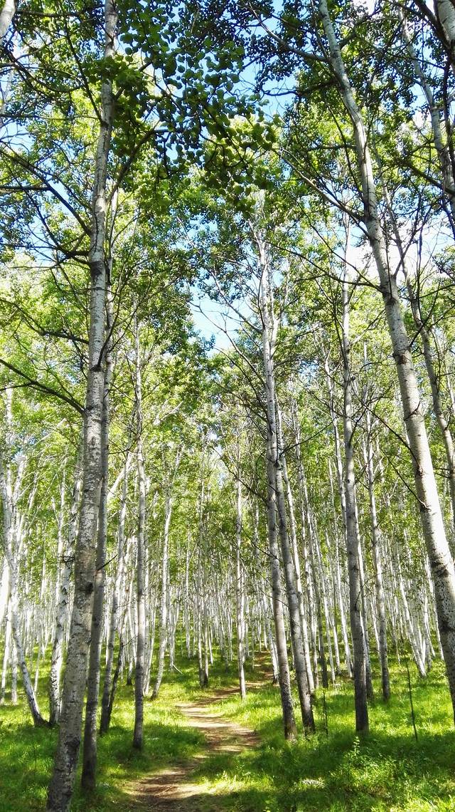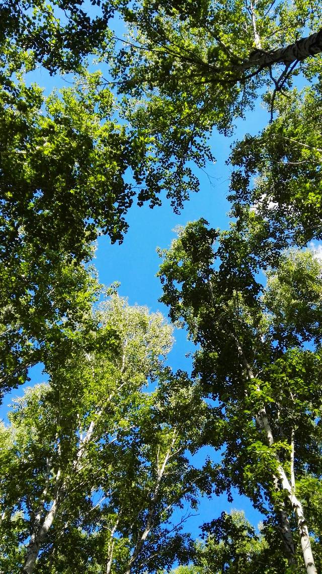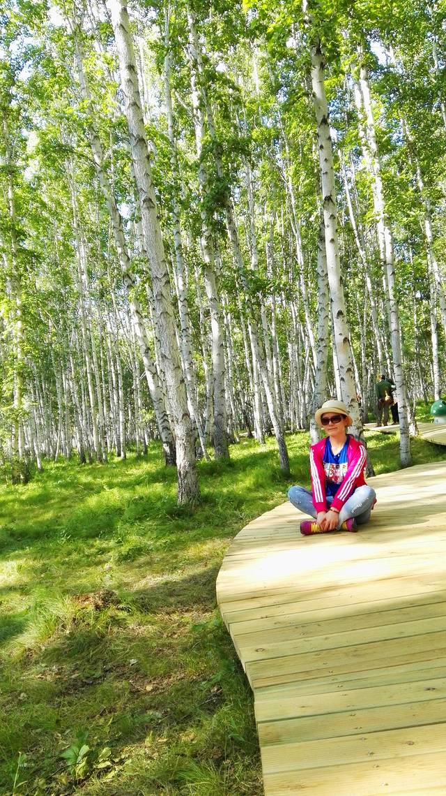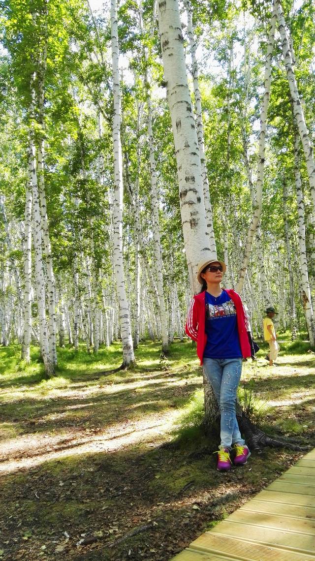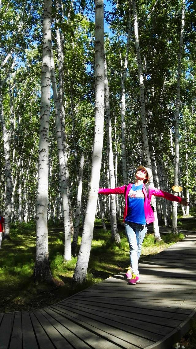 笔直高高的树干,白色的树皮,还有那一道道的结疤,如少女黑色的眼睛。阳光从树叶间透射到地面,走在林间的木栈道上,踩着斑驳的树影,再抬头望望高耸的树干,那一片片白云飘在树尖上,此刻,时光静好,云淡风也轻。