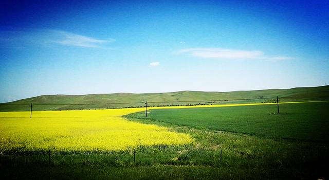 一路行驶,一路遇见,辽阔的草原,成群的牛羊,高高的山坡,密密的树林,就象一幅动态的水彩画。忽然,一片金色映入眼帘,油菜花开了!这里的油菜花完全不是我见过的被田埂隔成一小块一小块的,而是大片大片的花海。