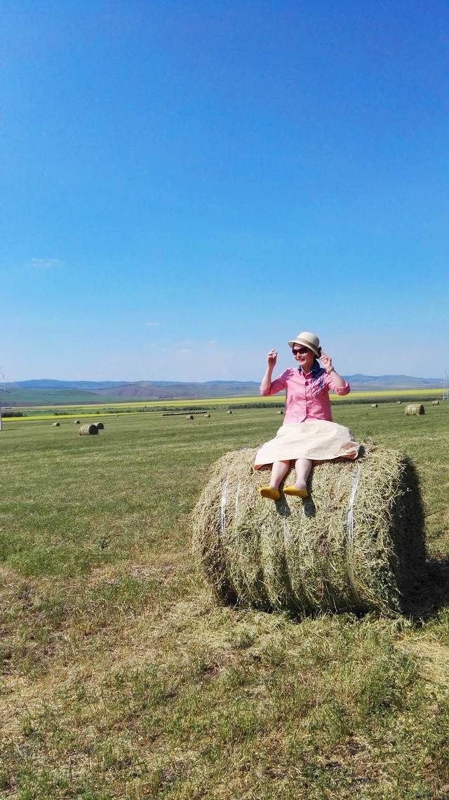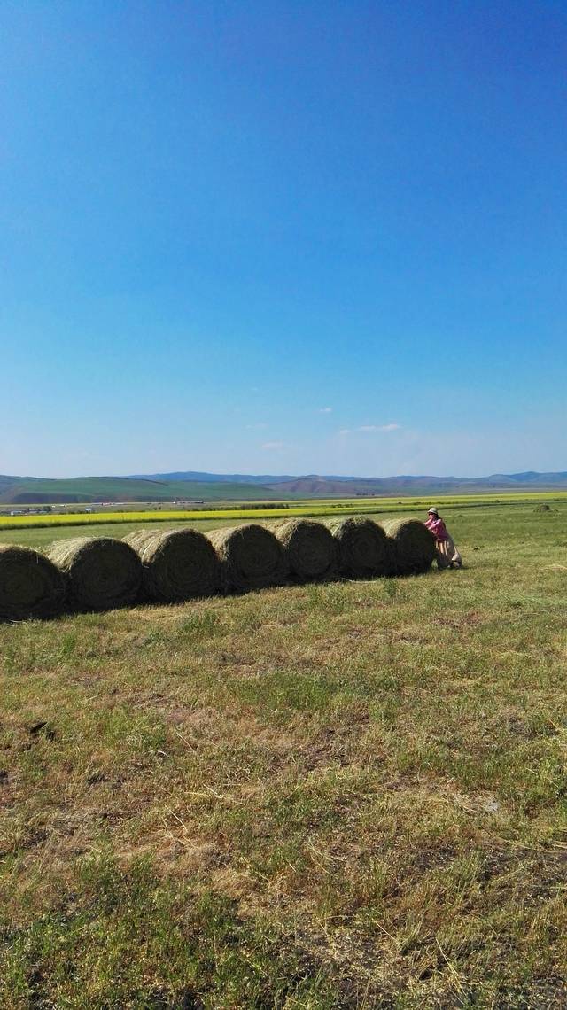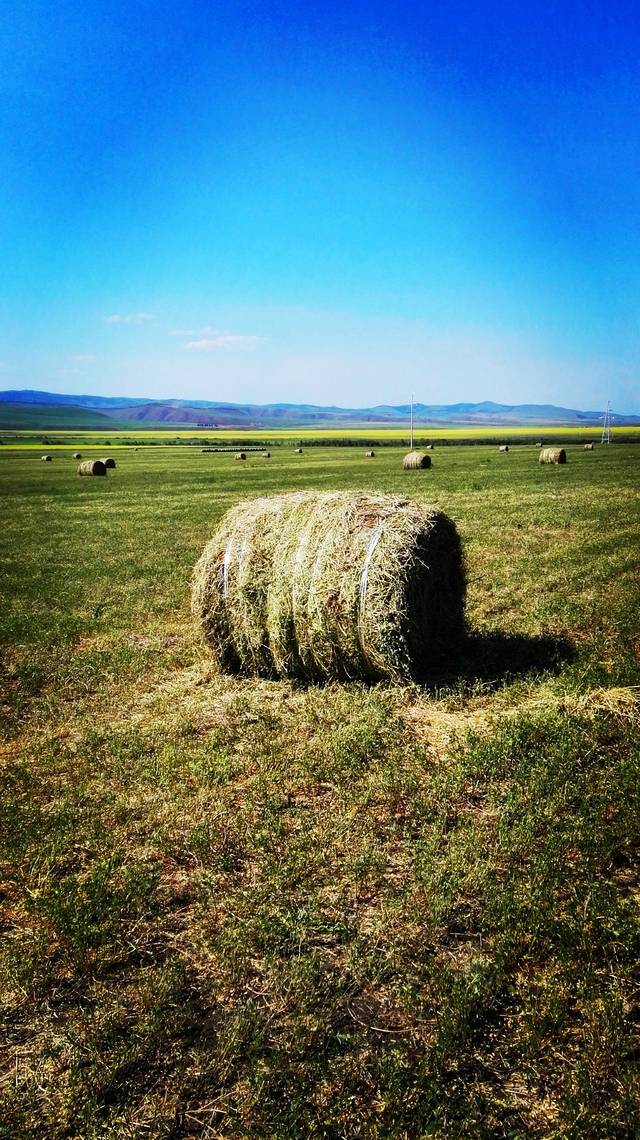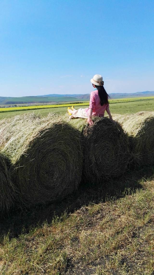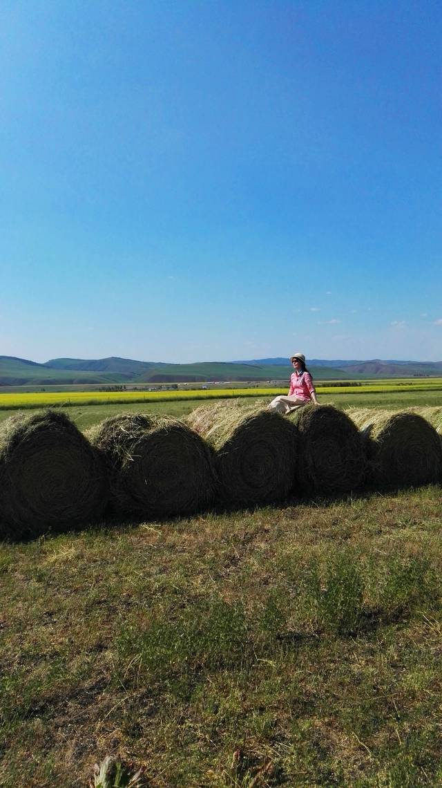 曾看到电脑壁纸里草垛的图片,总以为那是电脑合成的,直到我看到关于呼伦贝尔的游记后,才知道那是真的,于是,就非常想见到草垛。来呼伦贝尔之前,我的微信和QQ里就加了几个呼伦贝尔的司机朋友,我问他们什么时候能看到草垛,一致的回答是八月,可是让我等到八月再来,我已经是迫不及待了。一直为错过草垛而遗憾着,车子行驶在路上,我还念念不忘提这事。师傅在带我们去天下第一敖包的路上,哈大马忽然对我说,草垛!我欣喜若狂,飞向草垛!