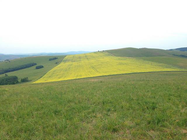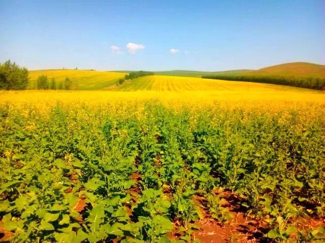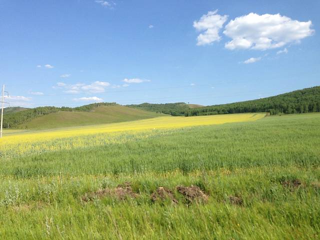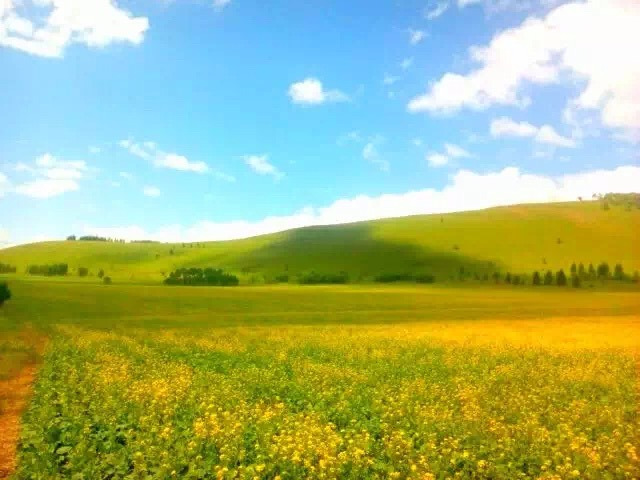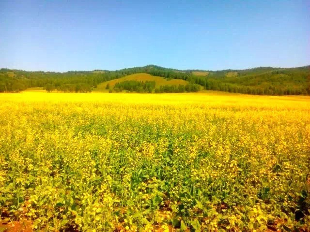 我已经忘了这是什么地方了,师傅把车子开到这个山上,环看四周,瞬间被这里的景色所陶醉。金色的油菜花,浅绿的草地,深绿的麦田,墨绿的树林,好一个巨大的调色盘!在这里,已经能看到根河湿地。