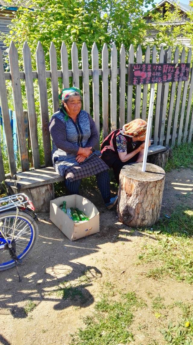 恩和,一个俄罗斯民族乡,这个乡的人多数是俄罗斯后裔,随处能见到一张长着俄罗斯脸却说着东北话的大爷大妈,小镇也因此而得名。二战前后来到中国的俄罗斯人,她们中的一些人与中国人通婚后就没再回去,当地人称俄罗斯人为老毛子,混血的二代为二毛,三代为三毛,不管是几代,他们的眼睛都变不了和华人一样,始终是那种浑浑的黄色。小镇上还有健在的俄罗斯人,她们已经八九十岁了。我们在小镇上转悠,不时地就能看到二毛三毛。我们来到一个面包房,当地人称面包为列巴,这个列巴房的老主人就是一位俄罗斯大妈,墙上挂着她的许多照片,有中国人民大学来此参观时帮她照的,当我打听大妈是否在家的时候,年轻的女主人告诉我大妈去医院看病去了,没能看到她,十分遗憾,还是祝老人家身体健康。继续沿着小镇的小路走走看看,发现一篱笆下坐着两位老人,一位六十岁左右,另一位岁数八十左右,大的那位在抽着烟,很像老毛子。停下来和她们打招呼,旁边的一位中年男子告诉我,那位岁数大的老人是俄罗斯人,是小点的老人她姨。二毛子倒是很热情,笑呵呵地对我们说:你们城里人就讲究穿,我们不讲究穿,讲究吃,我们肚子里都是油,死了值,逗得我们哈哈大笑。我对俄罗斯大妈说:给您拍个照好吗?大妈很不友好,用不太流利的中国话说:不照,说不照就不照,然后把头扭过去。
