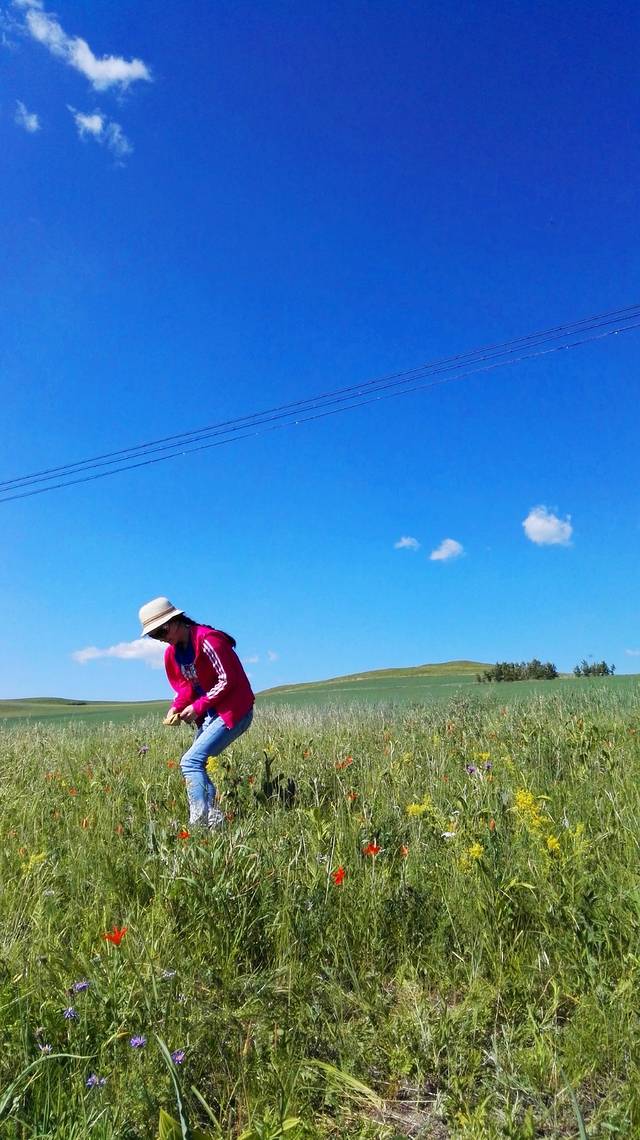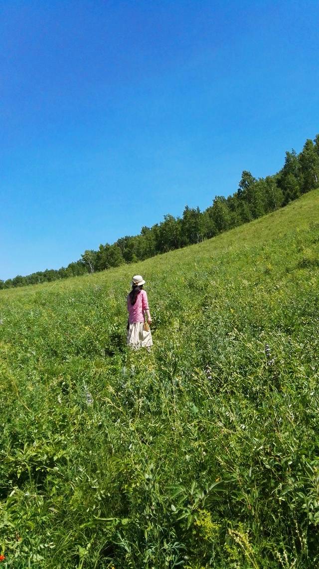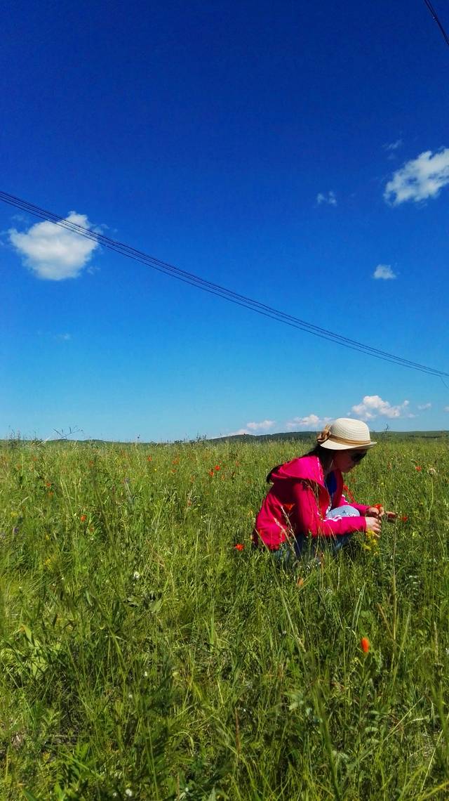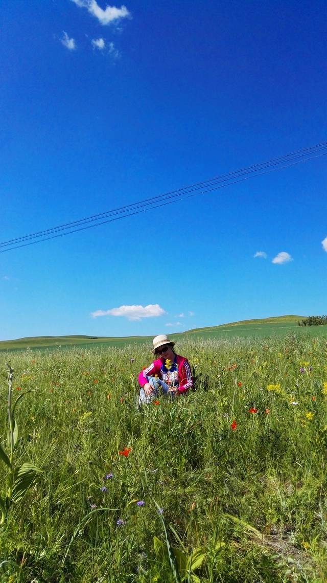 不知从何时起,变得敬畏自然,敬重生命,哪怕是一朵小花,一棵小草,都不忍伤及。山坡上到处盛开着各种野花,我只认得芍药,好想摘一束野花高高地举向天空,定格下美好,这是我一直在脑海中勾勒的画面。但是,怎能因为我的到来而终止她们的自由生长?最后,一朵也没摘,只是用手轻轻地触摸她们,和她们对话:小小的花儿啊,长在这样的蓝天下,原野里,多么幸运,多么美妙!