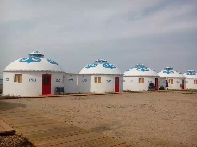 金帐汗是个收费的景点,我们没有进去,只是在门口看了看,旁边有其他免费的部落,这里我见到了电视剧里的蒙古包,一个个白色的蒙古包散落在草原之上。还有老舍笔下的天下第一曲河——莫日格勒河,如一条白色的带子蜿蜒迂回在辽阔的大地上。