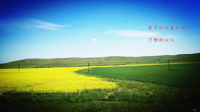 回来后,很多人问我景点怎么样,其实,我想说的是,呼伦贝尔草原没有景点,车子行驶在辽阔的草原上,抬头是蓝天白云,低头是一望无际的草地,还有那牛羊满山坡,金灿灿的油菜花海,绿油油的麦浪,这些就足够,所有的遇见,都是最好的,最美的风景在路上。