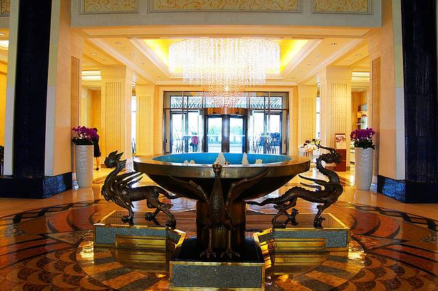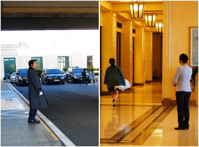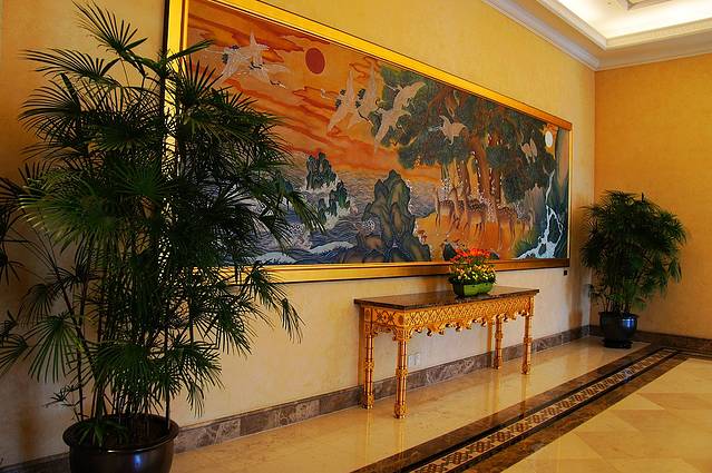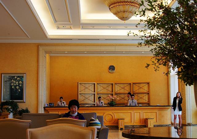 酒店在正面看就是一座五层的建筑,实际是十二层,地平面下还有七层。酒店的接待大厅在地平面一层,也就是八层。大厅装饰华丽,基本都是采用大理石装修,墙上一大幅韩国特色的贝壳画,下面条几上的鲜花经常更换。