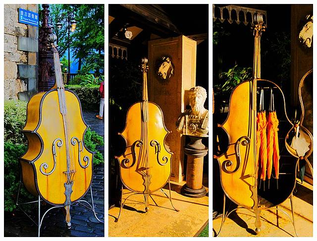 从庄园旁一个不明显的坡路来到庄园门前,门旁立着一把大提琴,这把大提琴可以开启,里面可以装雨伞,旁边像是艺术家的雕像。餐厅门前同样有一把,只是不能开启而已。