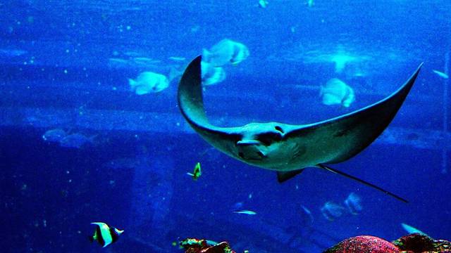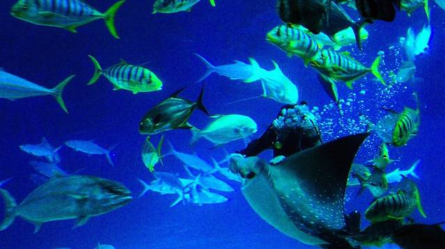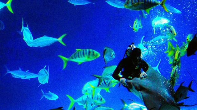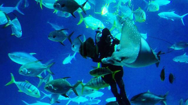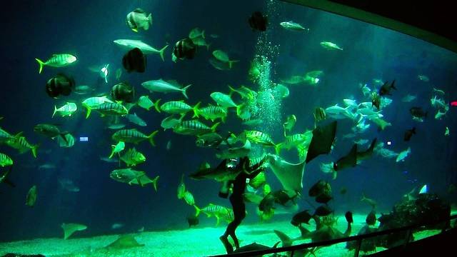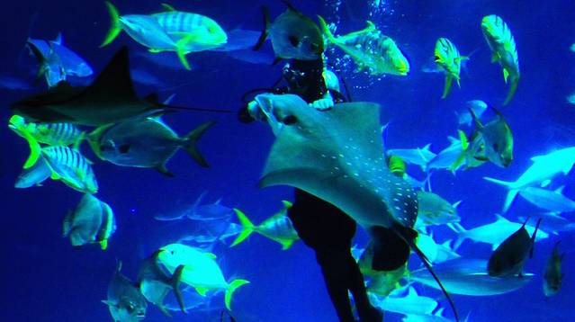 在台湾水域馆看大洋池喂食,导览在一旁解说