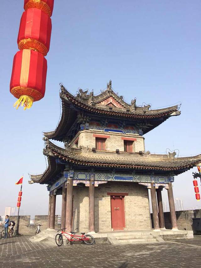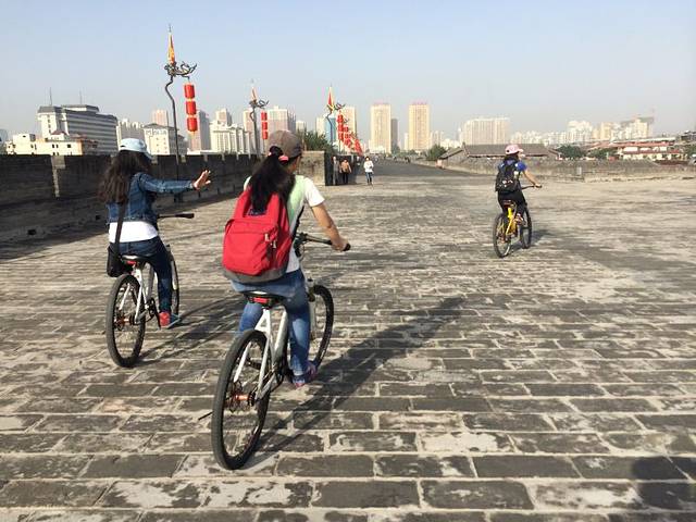 建议大家早起去古城墙,这样可以慢慢骑,还免去了日晒之苦。我们到的时候人还不是很多,租上一辆小自行车便开始了我们的环城之旅,四四方方一座城,骑行一圈下来真是汗流浃背啊!城墙内外因为文物保护的原因,是两种不同的建筑特色,一面是高楼大厦,一面仍旧是低矮的房子,还有不少的商家盖的仿古建筑,也是别有一番滋味啊。