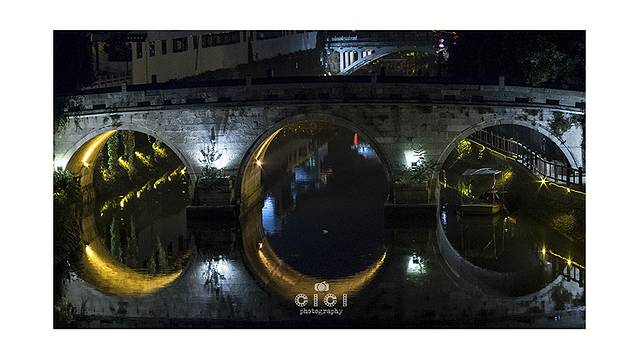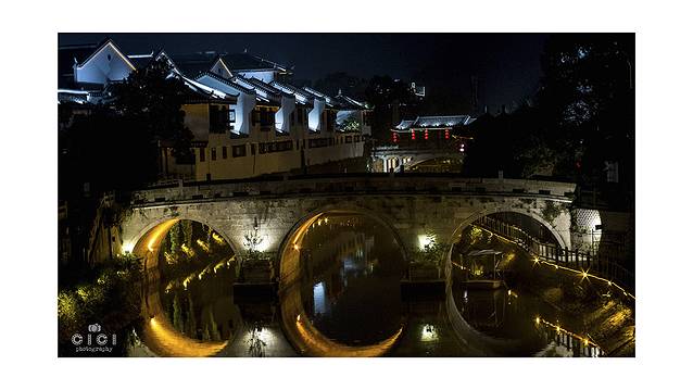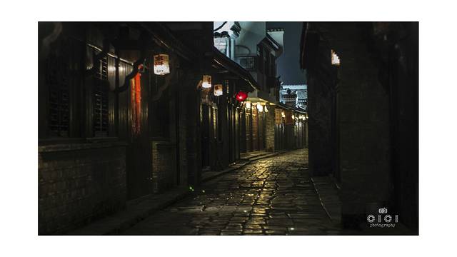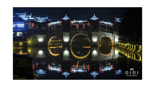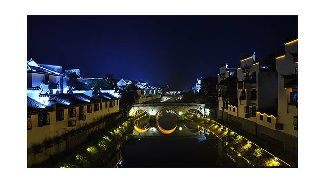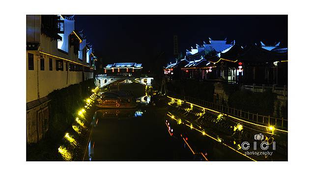 饕餮完毕,夜色已浓,即便是盛夏之时亦觉稍许凉意。船夫都休息了,船游的计划只好做罢,只好沿岸散步,青砖石板,道路错杂,小巷深深中的古镇只有一个朦胧的影子,踩到的石板路却是真实的,身边可以感觉的老墙、灰砖、原石、老木门及门框都无一例外的真实,古镇的气息扑面而来。偶有几个人走过,不知道是像我们一样的游人,还是小镇居民,小狗狗慵懒地趴在一边,只抬抬眼皮,连尾巴都懒得摇。 夜深人静,说的大概就是此情此景,想来古人中不乏归隐之士,寻的就是这份乡间的清心养性,恬静自得吧。 离开前再看古镇一眼,一条小河从镇中穿过,商铺陆陆续续都关张了,剩下国粹楼还点着灯,倒映在水里,静静地立在河岸,一如过去的年年岁岁……
