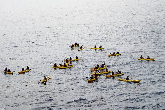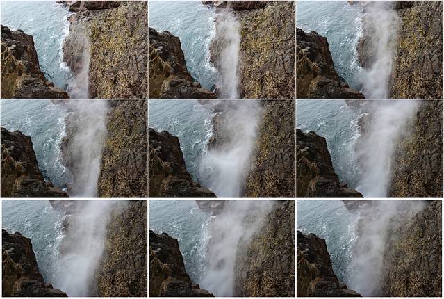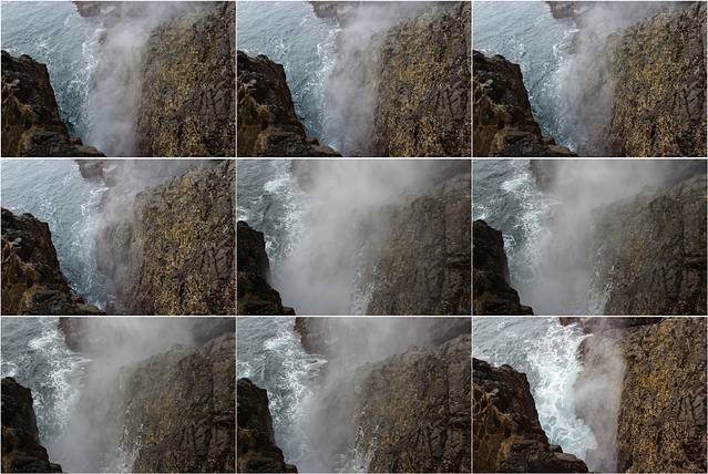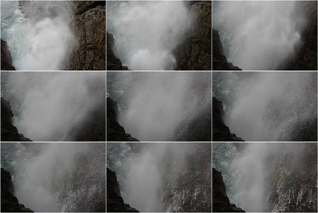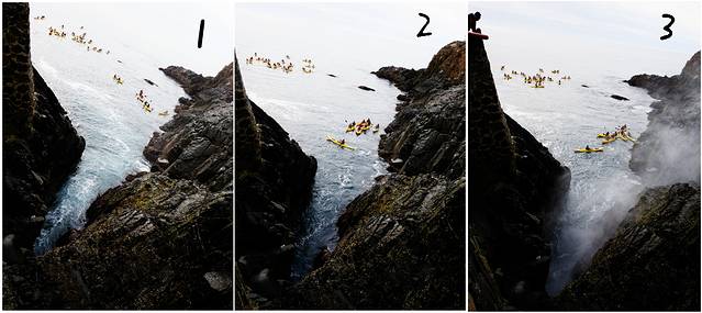 等我穿过窄窄长长的一条小街,看到海了,但是看到有个地方里三层外三层的游客围着,于是我好奇也挤了进去,找了个位置靠近看。发现游客们也都是睁大眼睛,齐刷刷盯着谷底,等待着那激动人心的时刻。哇塞!!!!!