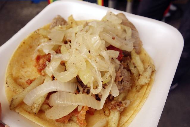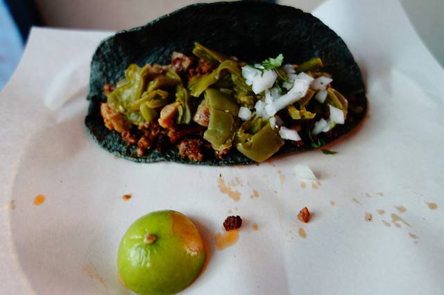 其实这只是一个场地,里面有4个还是5个小摊?然后每天摆摊的位置是轮流移动的。其中两家特别好吃,类似于Taco这种,只是大家玩的花样不一样,有猪肉牛肉鸡肉这种。5比索一个。