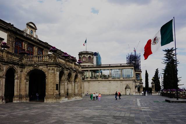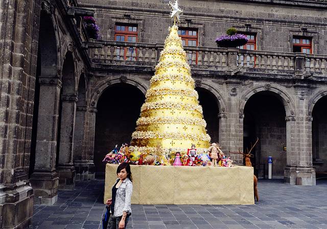 在Zócalo站下车,出站就是宪法广场。现在宪法广场是政权机关所在地,这里包括了几个最重要的建筑,东侧是国家宫殿(总统府所在地),北边是首都大教堂,南边是政府办公处,西边则是一条拱街,两边是珠宝店和豪华餐馆和宾馆。空旷的广场经常是各种活动的举办地及游行的聚集地,周末晚上基本上都有活动,我们就看到了有类似东北雪地滑轮胎的那种建造了人工冰梯,很想玩的,不过排队人很多。