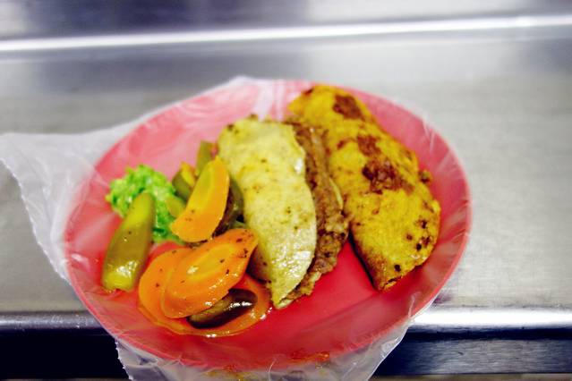 排队付钱拿牌子然后直接从大筒里面拿俩个扔在盘子里。然后可以进去找位子坐,由于之前路边摊的店看哪人多去哪吃然后吃到好吃的墨西哥TACO好吃到飞起来,然后对墨西哥TACO充满无限喜爱,没想到一吃,一般TACO里面不是是各种猪肉牛肉鸡肉么,这边也是肉,只不过不知道是为了节省时间还是什么,肉全部做成了肉泥,一吃软绵绵的,但肉还是很多拉,觉得这边吃的人多也可能是墨西哥的口味或者实在是因为5比索能吃饱。但真的很难吃,绝对是整个墨西哥吃到最难吃的TACO,最难吃的东西。桌上有是供食客免费取用的配菜:腌酸胡萝卜和辣椒和各种辣椒酱。。