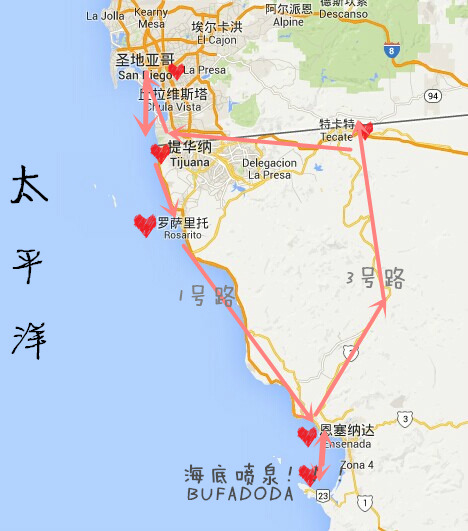 很多人来了去圣地亚哥会去蒂华纳Tijuana一日游,但其实还可以再往深入一点。。下图路线距离都很近,开车都是一两小时。