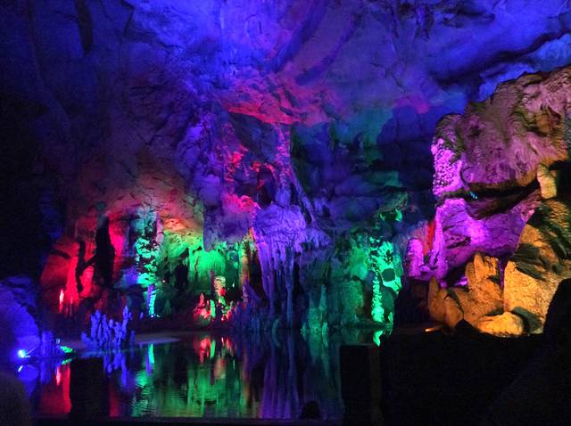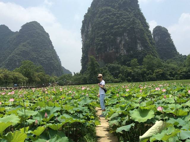 一进入十里画廊,到处到时游客,到处都是笑声,很快我们就被这个氛围带动起来,融入了进去。第一个地方是荷花池,面积不大,但是足够游客拍照留念。它就在马路边,所以很好找。荷花大大小小,有的已经绽放出它全部的姿色,有的还含苞待放,粉粉的,有的颜色稍微鲜艳一点,其中还有莲子长在它们中间,夹杂着,看上去整体画面还是那么诗情画意,清新淡雅。拍照后我们又向前骑行,我们的目的就是要去坐竹筏,感受一下遇龙河的漂流。所以我们把车停在大榕树景区,但是大榕树景区没有去看,听他们说里面就是一棵千年的榕树,无其他特色。停车后我们在门口拍了照片,就前往遇龙河。一心想着去景点门口买票,但是路边有很多问询你是否要去漂流的大姐,他们是当地人。一般情况下我是不太愿意去搭理他们的,因为我知道要被坑,价格会叫的很高,但是男朋友没有忍住就问了一句。大姐说漂流180元两个人,漂流一个半小时。之前我们是了解过价格的,两个人150元,还可以讲价。我觉得贵了,后来讲讲价,降到160元,我们心想着150元就好了。但是他说就160,我们也让步,就开始跟着他们走。漂流就是从上游到下游,全程应该有3-5公里吧。水里凉凉的,很清澈。进行漂流的人也很多,大家在江里游着,拍着周围的风景,很是惬意。那里的风景就像是武侠片里面的画面一样,可以想象一位高人站在竹筏的前段,撑杆人在后排,路过周围的竹林,山水,凉风习习,悠然自得。结束了漂流,我们又向前进,在一个叫月亮山的地方停下了,但是月亮山是爬山,我们骑着电动车不方便,所以就没有前行。只是看到月亮山的造型独特,拍下照片作为“到此一游”的证据。继续前行,到了一个叫做聚龙潭的地方,之前这里都没有了解过,不知道里面是什么样的风景,但是它是国家4A级景区,那还是去看看吧。里面的景色没有让人失望,岩洞的岩石各种造型,里面的灯光也五颜六色,灯光照在岩石上面,别有一番特色。出景区,已经是傍晚,肚子也饿了。计划的是晚上去西街,试一下啤酒鱼,感受 一下当地的文化。