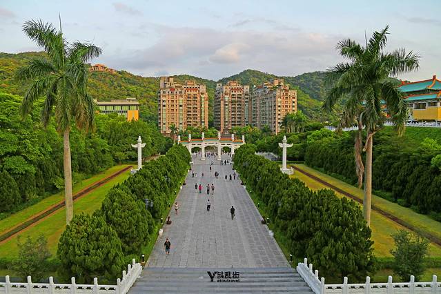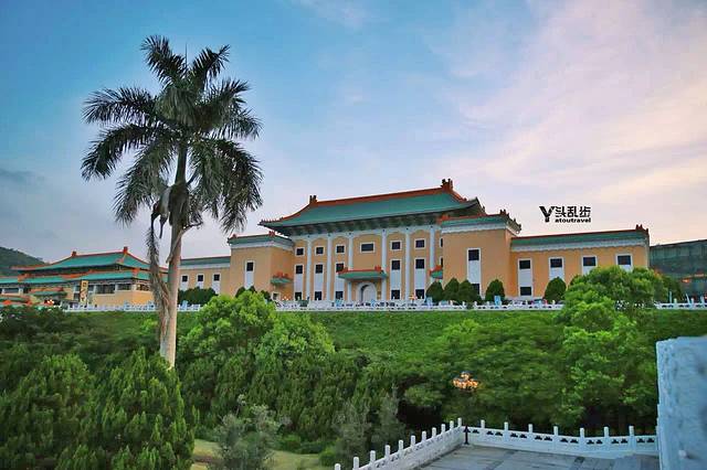 [台北故宫博物院]的气质,相较于北京故宫,走的是清丽典雅范儿,淡蓝色琉璃瓦屋顶,覆盖着米黄色墙壁。