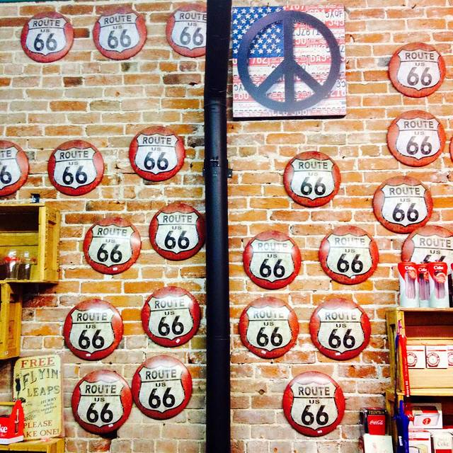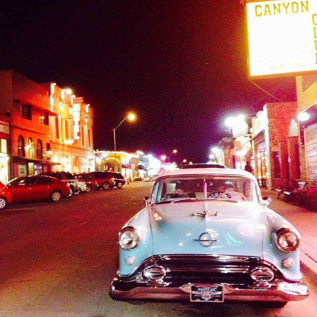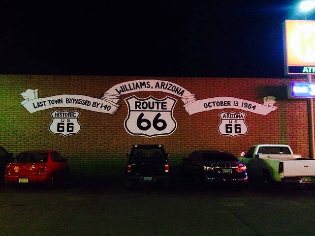 Williams小镇通常被认为是通向大峡谷的门户。镇上有一条东西向的主街,街两旁都是各种各样的66号公路元素小店,加油站的墙上画着66号标示,啤酒屋外挂满了66号路牌。夜晚的小镇霓虹灯闪烁,满眼的66,路上还有扮成西部牛仔的当地人悠闲地走在街上,简直就是电影里的走出来的赏金猎手和他们的疯狂西部梦。
